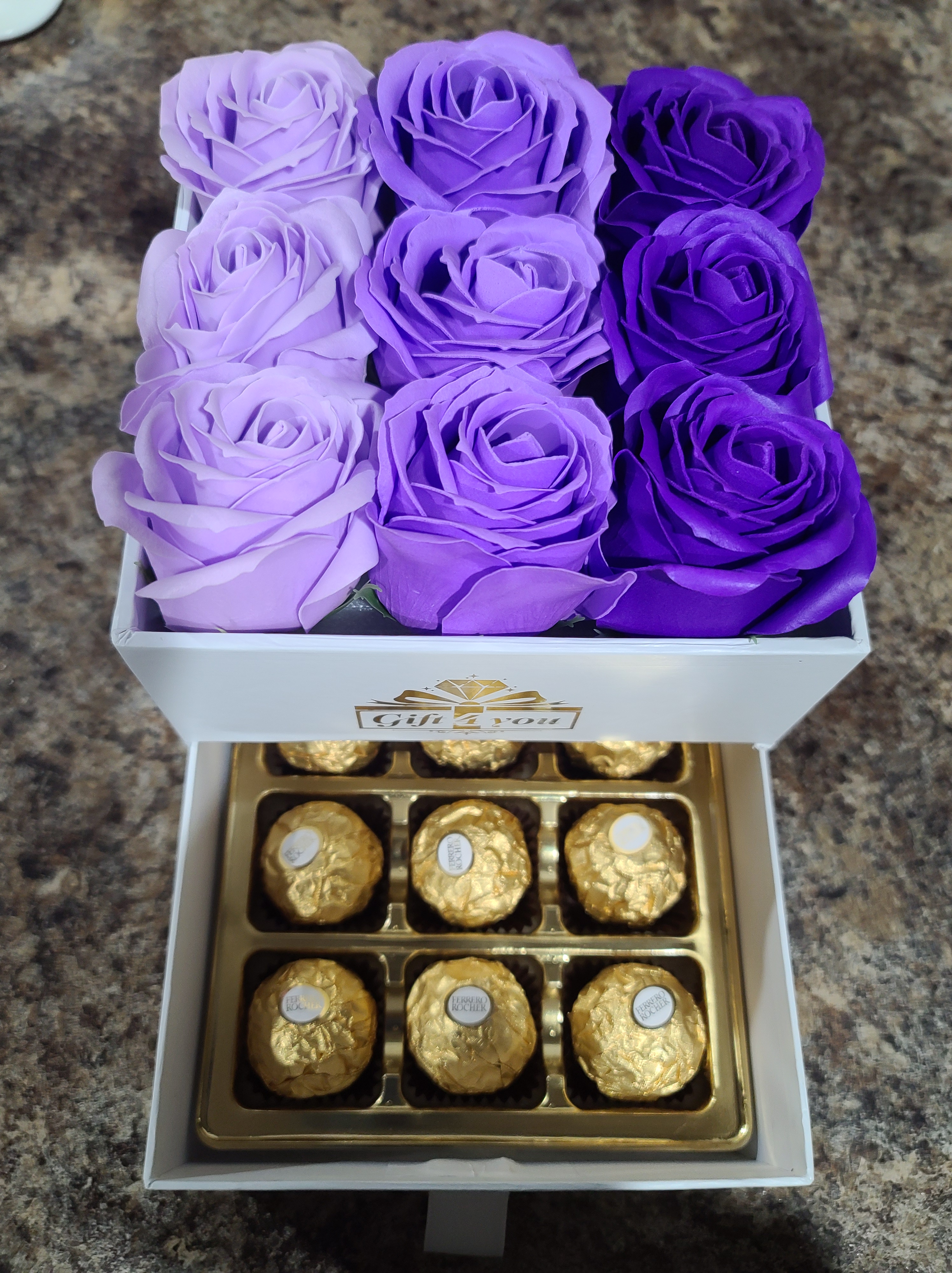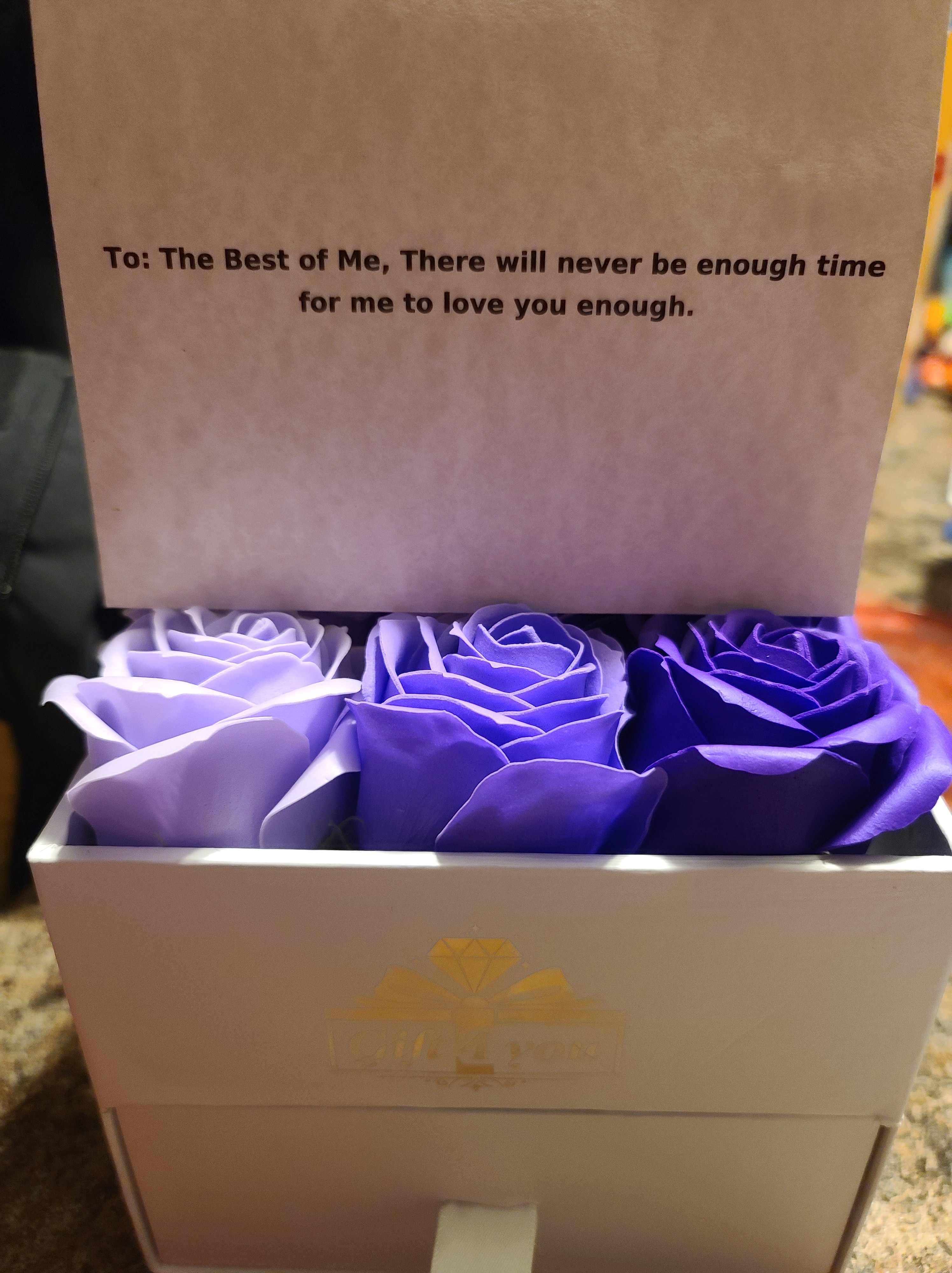 There were the most beautiful purple Ombre roses in the box once I got it opened and the scent was unbelievable. I had covid around Christmas and my smell still hasn’t really gotten back to normal but I could absolutely smell these. As I ran my hands over them, the silky feel I always know the touch of rose petals will bring did not disappoint. They were breathtaking. As I investigated further, trying to figure out where he got them from, I saw that THEY WERE SOAP.
